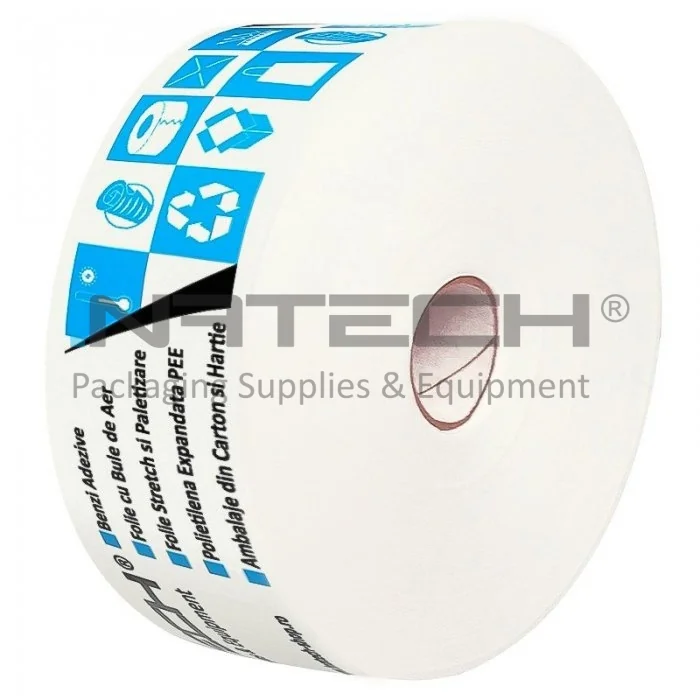 Banda Adeziva Umectibila Personalizata 60 mm x 200 m Lungime 200 m, Numar Culori 2 Culori, Latime 60 mm, Adeziv Amidon, Tip Imprimare Pe Suprafata, Culoare Natur, Buc / Pachet 250