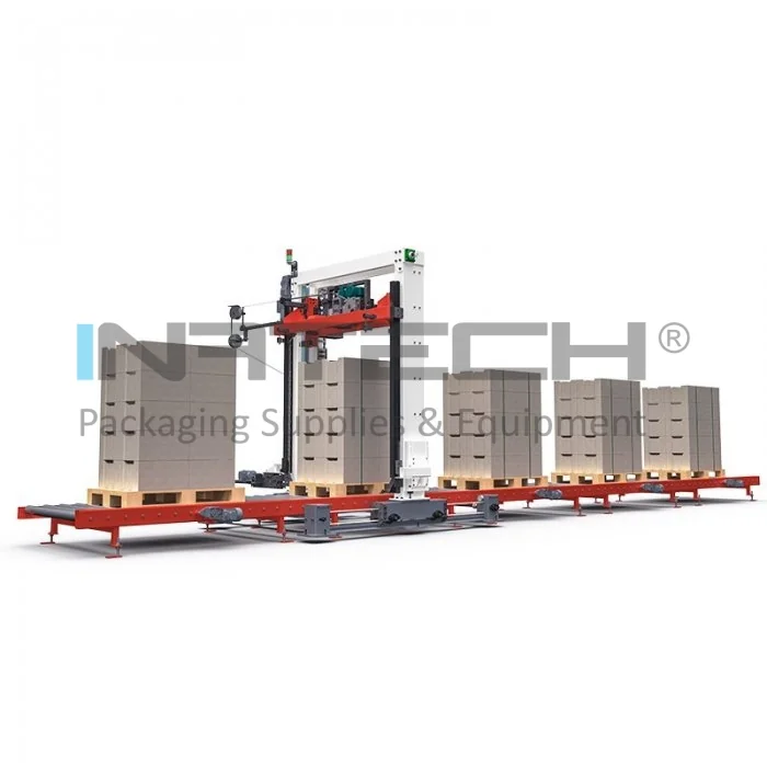 Aceasta solutie este ideala pentru aplicatii industriale unde eficienta procesului este esentiala, inclusiv in industria betonului sau in alte domenii de productie grea. Designul cu cadru deschis permite introducerea benzii deasupra nivelului transportorului si utilizarea transportoarelor cu role. Paletii sunt introdusi longitudinal, raman suspendati intr-o singura pozitie pe toata durata legarii. Masina se deplaseaza autonom catre fiecare punct de legare prin actionare motorizata, fara a restrictiona fluxul de productie sau alte operatiuni desfasurate pe linie. In acest mod, nu mai este necesara repozitionarea succesiva a paletilor pentru fiecare punct de legare.