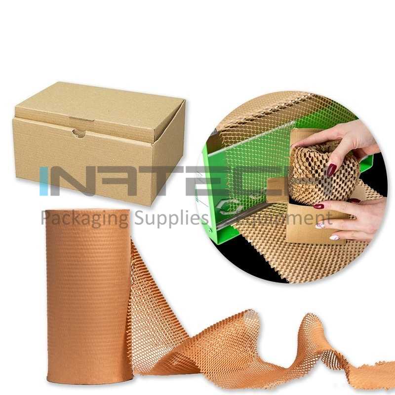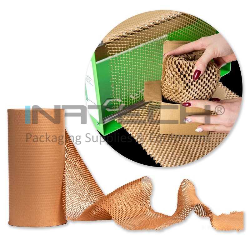 - Rolă hârtie Kraft Honeycomb standard (80 g, 250–450 m) – material eco-friendly, 100% reciclabil, care oferă protecție excelentă obiectelor fragile. Structura tip fagure absoarbe șocurile și elimină nevoia de folii cu bule din plastic.