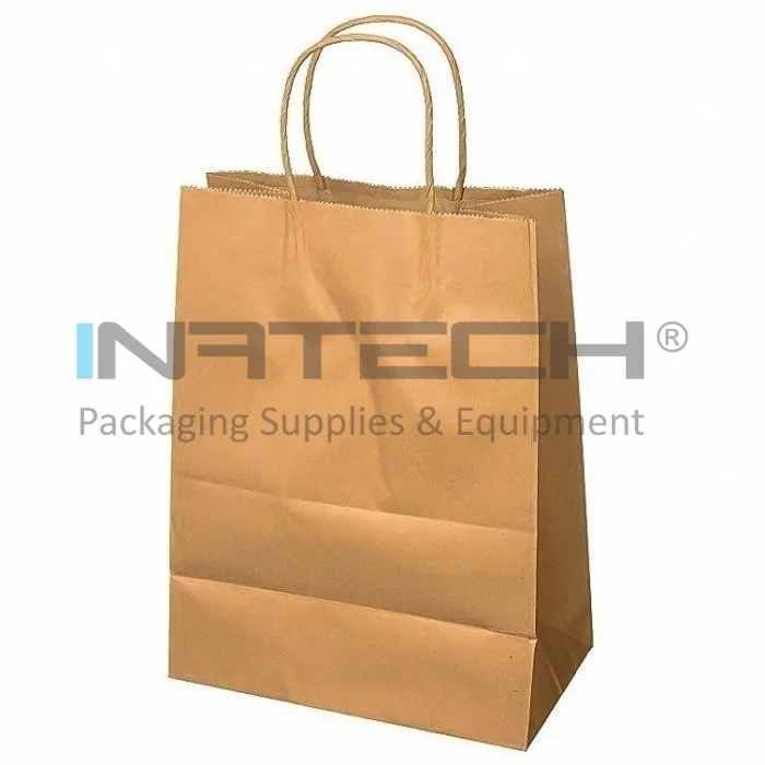 Бумажные пакеты с закрученными ручками, белые / натуральные, размеры 250 х 110 х 300 мм, тип ручки - веревка, материал - бумага 90 г/м2, натуральный цвет, 100 штук в упаковке.
