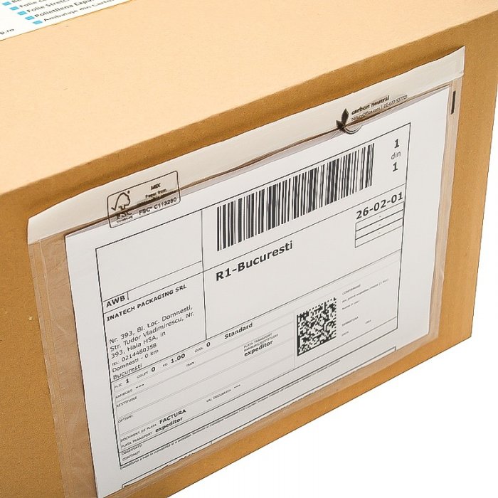 Plicurile adera perfect pe diverse suprafete – carton, folie stretch, plastic sau metal – si raman fixate ferm, fara riscul de desprindere. Transparenta ridicata permite verificarea rapida a documentelor, fara a fi nevoie de deschiderea coletului.