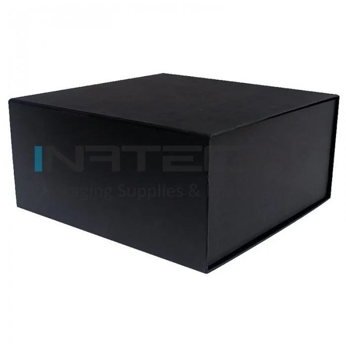 Коробка для подарков с магнитной застежкой длиной 230 мм, шириной 230 мм, высотой 110 мм, черного цвета, тип картона - мука, система застежки - магнитная.