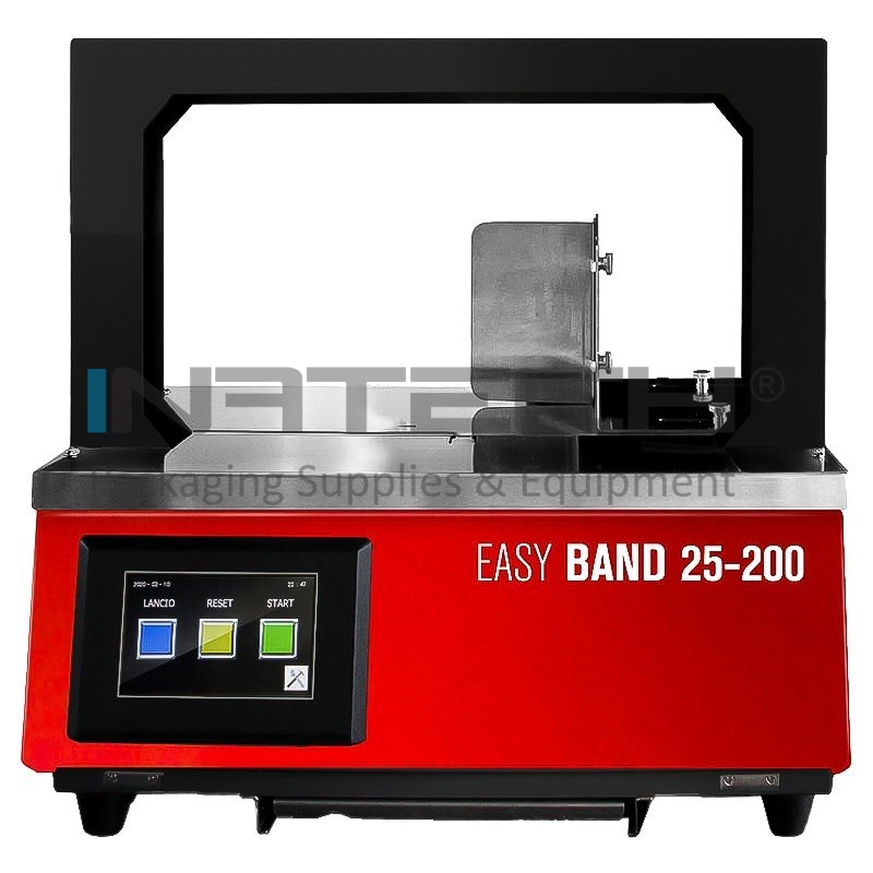 Машина для связывания с BOPP лентой Easy Band 25-200, скорость упаковки 25 циклов/мин, ширина ленты 12 мм, тип ленты BOPP/PE, питание 220 В - 50/60 Гц, максимальный размер коробки (мм) 220 x 170 мм.