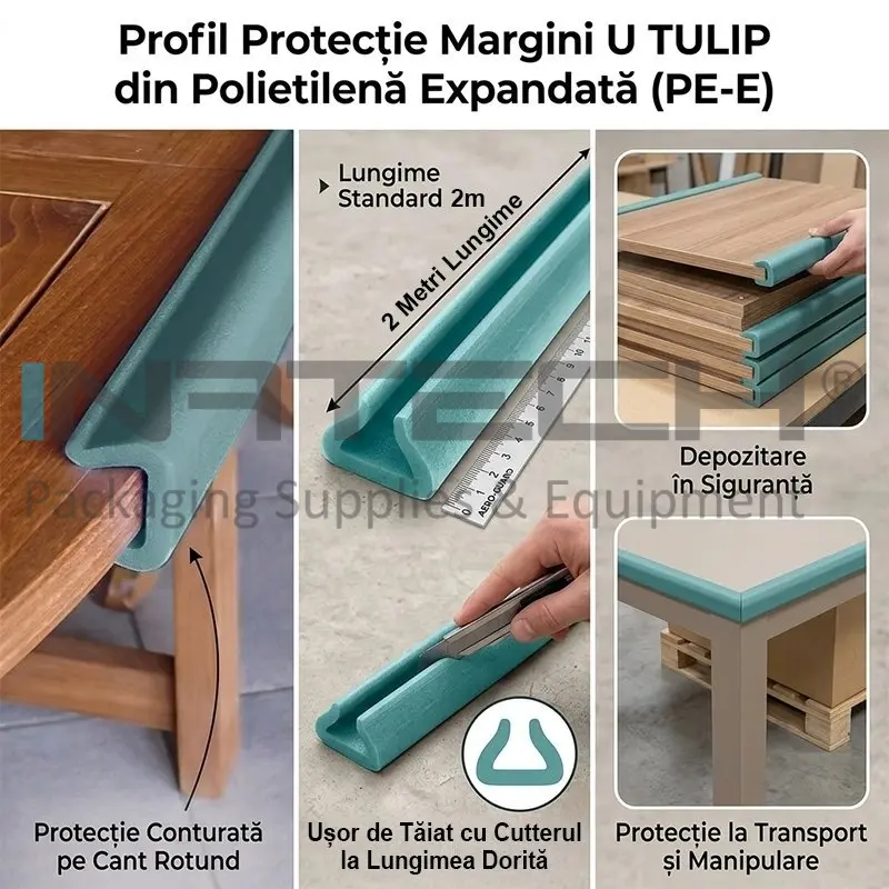 Coltar U Tulip Din Polietilena Expandata folosit pentru protectia marginilor de mese, rafturilor, panourilor din lemn, mobilierului sau pentru o protectie sporita in timpul transportului sau depozitarii diverselor produse. Acest profil U tulip din polietilena expandata are 1 m lungime, dar poate fi redus pana la lungimea dorita de dumneavoastra cu un cutter.