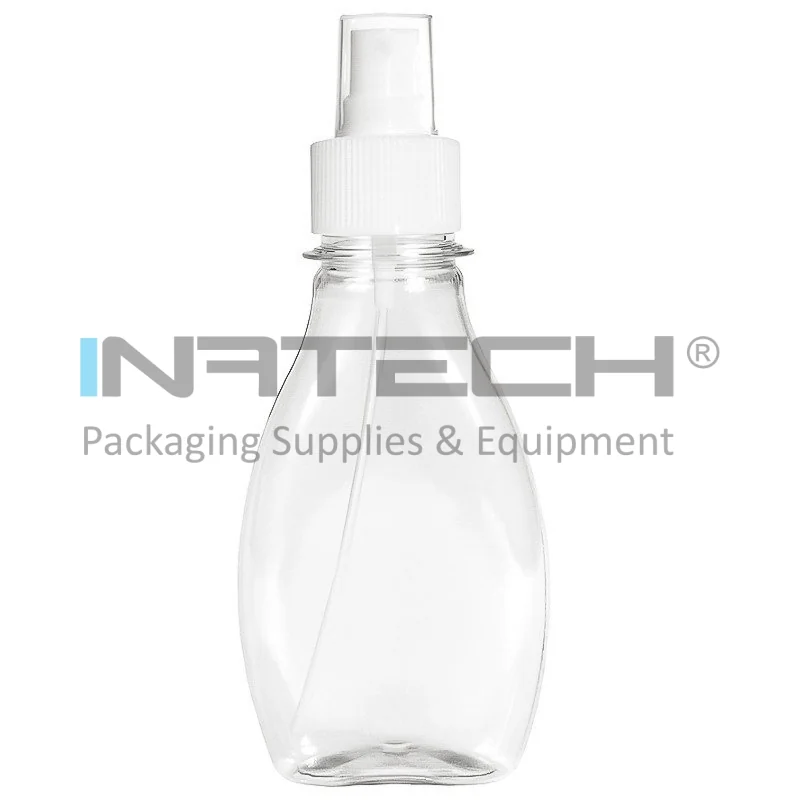 Пластиковый контейнер в форме торпеды, тип крышки - спрей, диаметр резьбы 28 мм, без ручки, объем 100 мл, цвет прозрачный, 10 штук в упаковке.