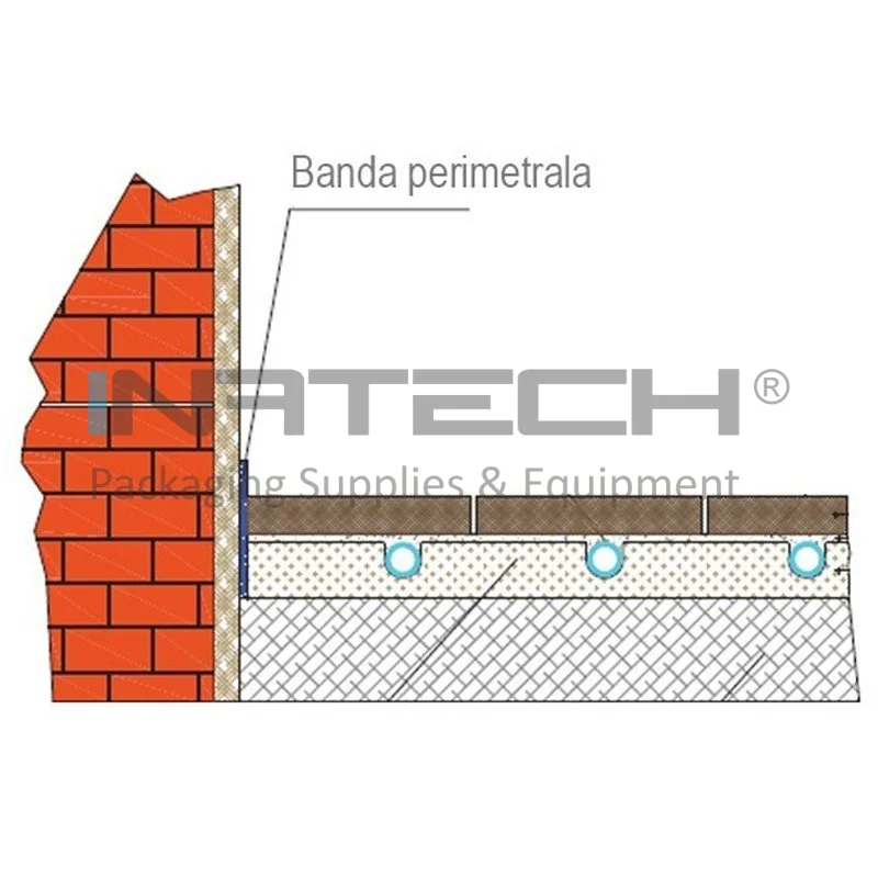 Banda Perimetrala Cu Folie este proiectata pentru a putea fi folosita la incalzirea in pardoseala in cladiri rezidentiale sau pentru birouri, spatii de depozitare, productie sau cu destinatii sociale. Separa sapa flotanta de pereti, este folosita ca rost de dilatare si izolant fonic.