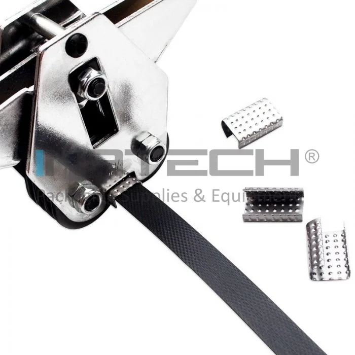 Dispozitivul pentru legat banda PP se utilizeaza impreuna cu setul de capse metalice de 12/16 mm.