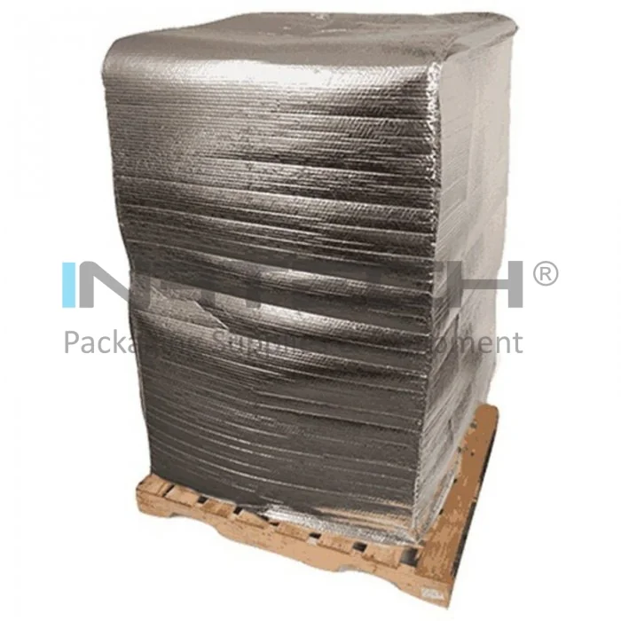 Thermo Pallet Cover este o solutie de protectie termoizolanta profesionala, proiectata pentru ambalarea paletilor si a produselor de mari dimensiuni. Fabricata din folie cu bule de aer de 140my grosime, laminata cu strat PET aluminizat de 11my, aceasta husa asigura izolatie termica eficienta, protectie impotriva umiditatii, socurilor si murdariei. Este utilizata in ambalarea produselor din lemn, materiale de constructii, ceramica, sticla, mobila, produse industriale sau chimice.Thermo Pallet Cover se aplica usor si este compatibila cu procese de ambalare manuale, semi-automate sau automate. Flexibilitatea materialului permite o aplicare precisa si sigura, protejand suprafetele sensibile impotriva zgarieturilor, loviturilor si influentei factorilor externi. Husa este disponibila in mai multe dimensiuni standard, cu tolerante precise, adaptabile diverselor tipuri de marfuri si cerinte logistice.